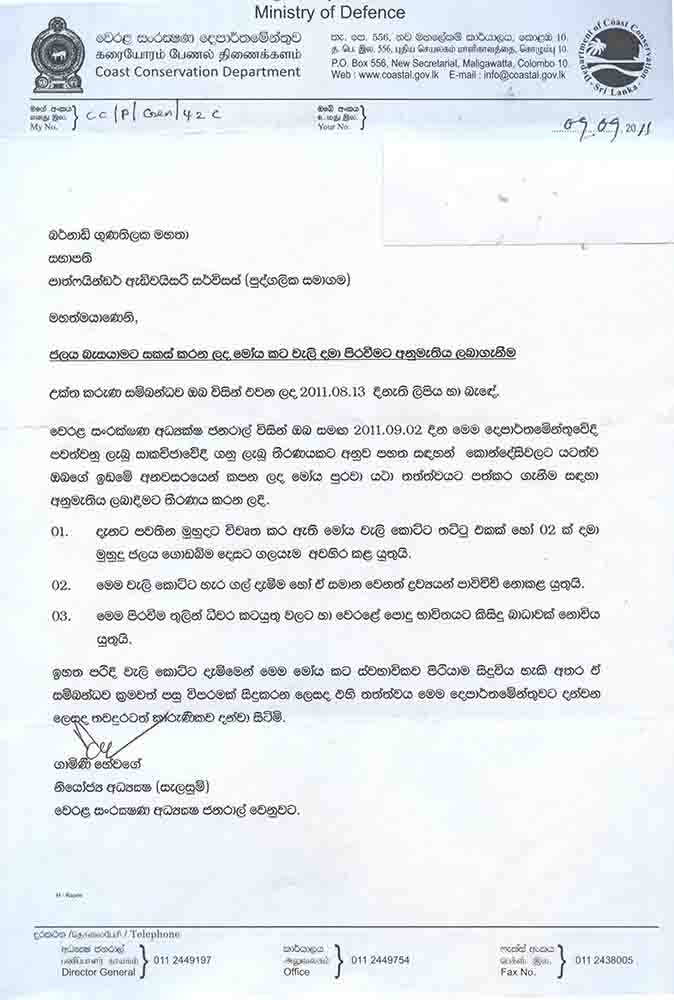 කෙසේ වෙතත්, මෙතෙක් කලක් රහසක්ව පැවති වෙරළ සංරක්ෂණ දෙපාර්මේන්තුව විසින් ලබා දුන් බව කියන එම අනුමැතිය (යොමු අංක CC/P/GEN/42 C) පරීක්ෂා කිරීමේ දී තහවුරු වනුයේ, එකී ලිපිය මගින් අවසර ලබා දී ඇත්තේ, අදාළ සමාගමට අයත් යැයි කියන ඉඩමේ ගම්වාසීන් විසින් බලහත්කාරයෙන් කපන ලද බව කියන ඇළ මාර්ගය සහිත මෝය කට වසා දැමීමට මිස, ස්භාවික මෝය කට වසා දැමීමට නොවන බවයි.