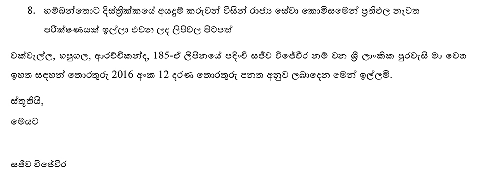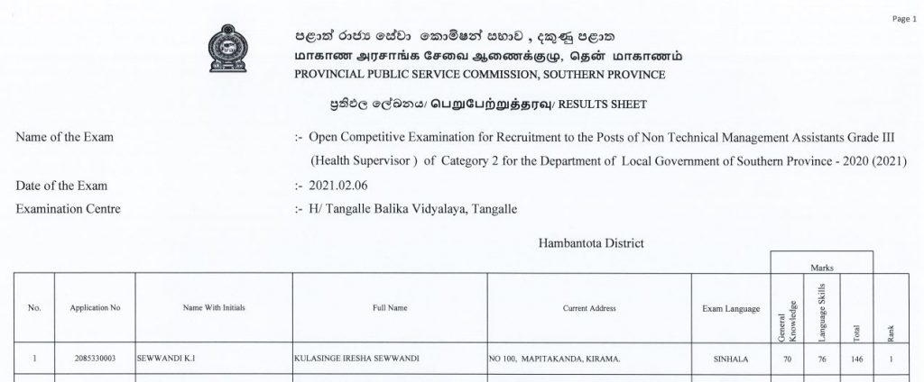 එම ලේඛනය අනුව හම්බන්තොට දිස්ත්රික්කයෙන් ඉහළම සුදුසුකම් දක්වමින් ප්රථම ස්ථානයට පත්ව එම දිස්ත්රික්කයේ එකම පුරප්පාඩුවට පත්වීම සඳහා සුදුසුකම් ලබා සිටියේ අයදුම් පත්ර අංක 2085330003 යටතේ විභාගයට ඉදිරිපත් වූ කිරම, මාපිටකන්ද පදිංචි කුලසිංහගේ ඉරේෂා සෙව්වන්දි නමැති අයෙකි. ඇය ලබාගත් ලකුණු සංඛ්යාව 146කි.