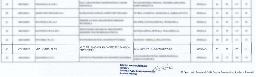 එම ලේඛනයේ 24 වැනි ස්ථානයට පත්ව සිටියේ මුතුකුමාරණ වගාච්චිගේ ඉමල්ෂා චතුරානි නමැති වීරවිල සේදවත්තේ දිංචි අයදුම්පත්ර අංක 2085360030 යටතේ ඉදිරිපත් වූ තැනැත්තියකි. ඇය සාමාන්ය දැනීම ප්රශ්න පත්රයට ලකුණු 66ක් සහ භාෂා නිපුණතා පරීක්ෂණයකට ලකුණු 40ක් ලබාගෙන මුළු ලකුණු 106ක් හිමිකරගෙන සිටියා ය.