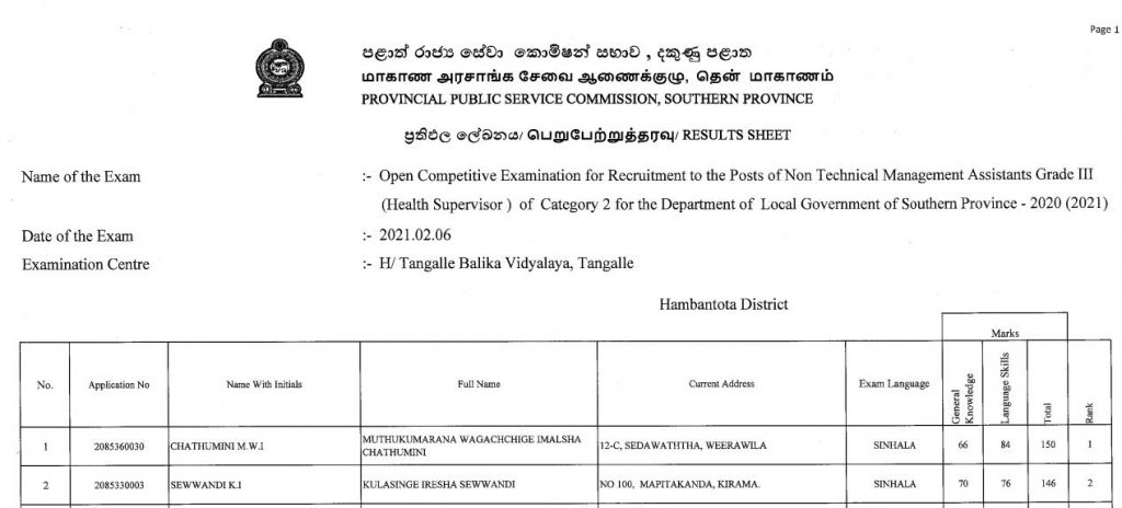 මාධ්යවේදියා – දකුණු පළාත් රාජ්ය සේවා කොමිෂන් සභාවෙන් 2021 පෙබරවාරි 06 පවත්වපු විවෘත තරඟ විභාගයේ ප්රතිඵල ලේඛනය මාර්තු 29 වැනි දා දාපු එක නැවත වෙනස් කරලා අද දාලා තියෙනවා. ඉස්සෙල්ලා දාපු ප්රතිඵල ලේඛනයේ හම්බන්තොට දිස්ත්රික්කයේ 01 වැනියට හිටපු කෙනා 02 වැනි තැනට දාලා 24 වැනියට හිටපු කෙනා 01 වැනියා කරලා. මේක වරදියි නේද ?