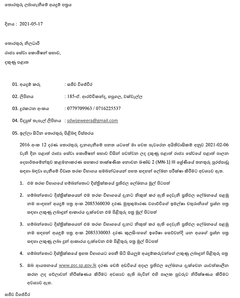 දකුණු පළාත් පාලන දෙපාර්තමේන්තුවේ කළමනාකරණ සහකාර තාක්ෂණික නොවන ඛණ්ඩ 2 (MN-1) III ශ්රේණියේ තනතුරු පුරප්පාඩු සඳහා බඳවාගැනීමේ විවෘත තරඟ විභාගය 2020 වර්ෂයේ ප්රතිඵල ලේඛන ඇතුළු තොරතුරු පරීක්ෂා කිරිම සඳහා අවස්ථාව ලබා දෙන්න යැයි තොරතුරු දැනගැනීමේ කොමිසම අද (10) දකුණු පළාත් රාජ්ය සේවා කොමිසමට නියෝග කළේය.