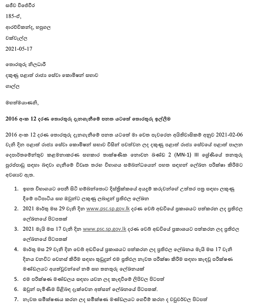 දකුණු පළාත් පාලන දෙපාර්තමේන්තුවේ කළමනාකරණ සහකාර තාක්ෂණික නොවන ඛණ්ඩ 2 (MN-1)III ශ්රේණියේ තනතුරු සඳහා බඳවා ගැනීමේ විභාගයේ ප්රතිඵල නිකුත් කිරීමේ දී සිදුකරන ලද ප්රතිඵල ලේඛන වෙනස් කිරීමක් සම්බන්ධයෙන් සජීව විජේවීර විසින් මාධ්යවේදියකු ලෙස රාජ්ය සේවා කොමිසමේ ලේකම් ගාමිණී වීරවික්රමගෙන් විමසීමක් කර තිබිණි.