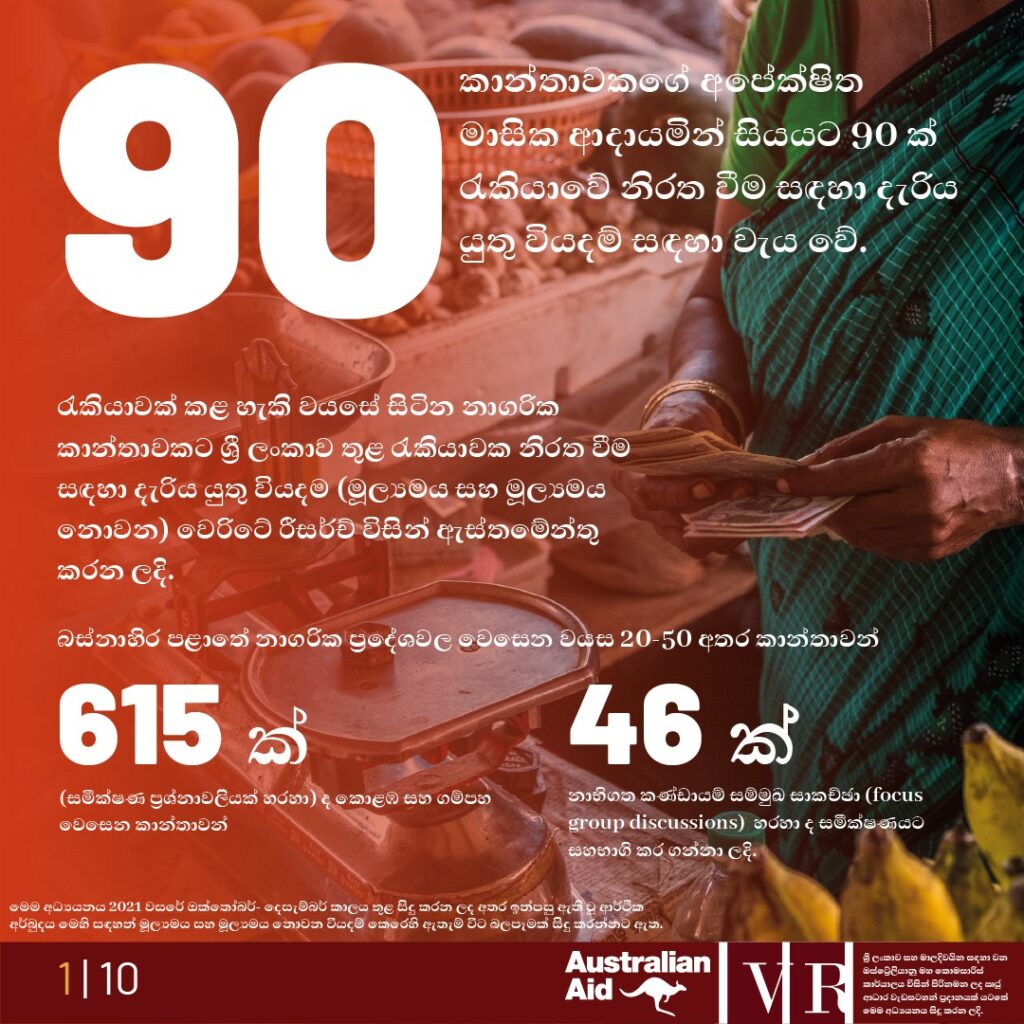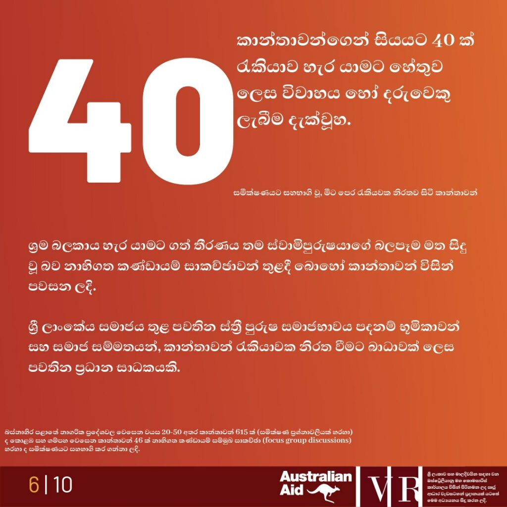 වෙරිටේ රිසර්ච් ආයතනය සඳන් කරන්නේ ශ්රී ලාංකීය සමාජයේ පවතින ස්ත්රී පුරුෂ සමාජභාවය පදනම් භූමිකාවන් සහ සමාජ සම්මතයන්, කාන්තවන් රැකියාවක නිරතවීමට බාධාවක් වන ප්රධාන සාධකයක් බවයි. එය මෙම සමීක්ෂණයෙන් ද අනාවරණය වී ඇත.