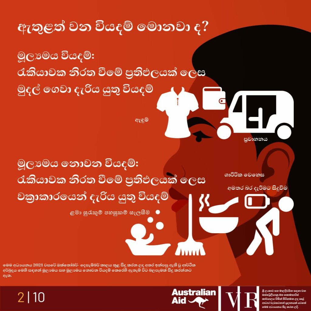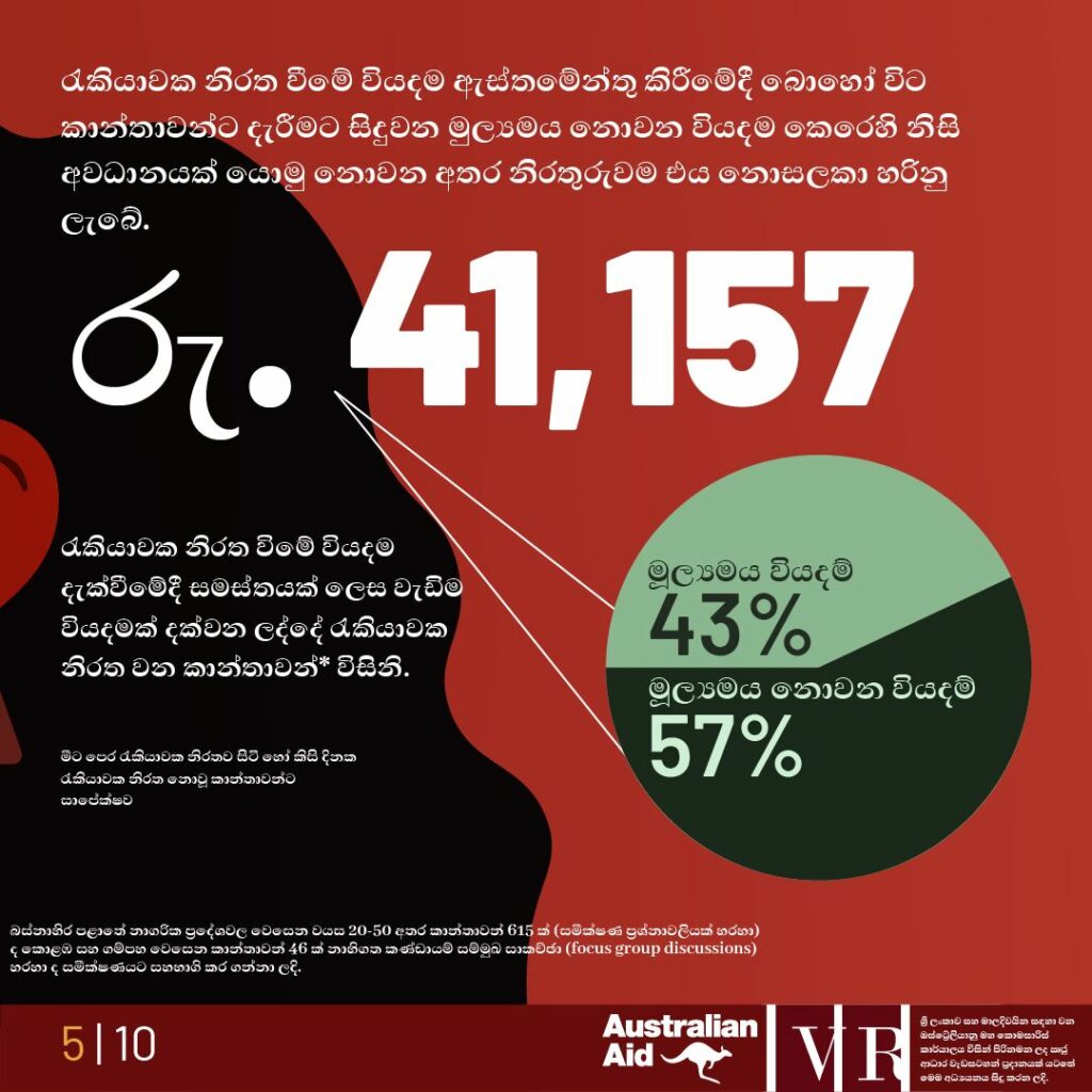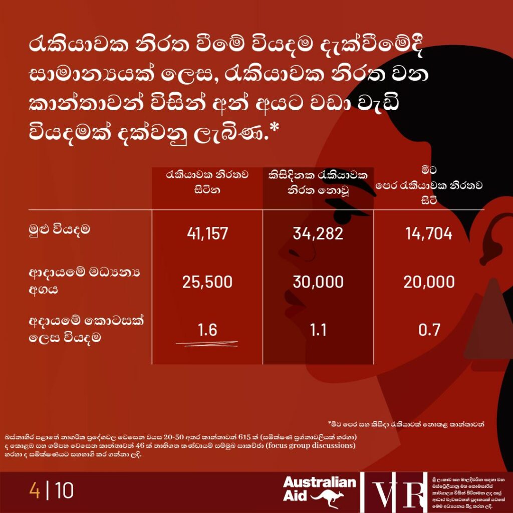 කාන්තාවක් තමන් ලබන මාසික ආදායමෙන් 90%ක් වැනි අති විශාල මුදලක් රැකියාවේ නිරතවීම සඳහාම දැරිය යුතු බව එම වාර්තාව පෙන්වා දෙයි. මේ සඳහා රැකියාවක් කළ හැකි වයසේ පසුවන කාන්තාවක් ශ්රී ලංකාව තුළ රැකියාවක නිරතවීම සඳහා දැරිය යුතු විය ද ම ද වෙරිටේ රිසර්ච් ආයතනය විසින් ඇස්තමේන්තු කර ඇත. ඒ සඳහා මූල්යමය සහ මූළ්යමය නොවන වියදම් ද සළකා බලා ඇති බව එම ආයතනය පවසයි. කොළඹ සහ ගම්පහ වෙසෙන කාන්තාවන් 615ක් සහ නාභිගත කණ්ඩායම් සම්මුඛ සාකච්ඡා සඳහා සහභාගී වූ කාන්තාවන් 46ක් යොදා ගනිමින් එම ඇස්තමේන්තු කිරීම සිදුකර තිබේ.