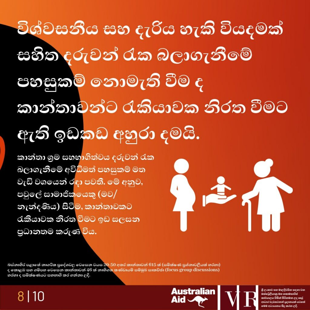 තමන්ට දැරිය හැකි වියදමකින්, විශ්වසනීය ලෙස දරුවන් රැක බලාගැනීමේ පහසුකම නොමැතිවීම ද කාන්තාවන්ට සිය රැකියාවලින් ඈත්වීමට හේතුවක් වන අතර නැතිනම් රැකියාවක නිරතවීමට බාධාවක් බවට පත්ව ඇත. දරුවන් රැක බලාගැනීමේ අවිධිමත් පහසුකම් කාන්තා ශ්රම බළකායේ පැවැත්මට තීරණාත්මක සාධකයක් බව ද මේ සමීක්ෂණයේ දී අනාවරණය වී ඇත. පවුලේ සමීප වැඩිහිටි ඥාතියකු (මව හෝ නැන්දණිය) සිටීම කාන්තාවකට රැකියාවක නිරතවීමට ඉඩ ලබාදෙන ප්රධාන සාධකයක් බවට පත්වත තිබේ.