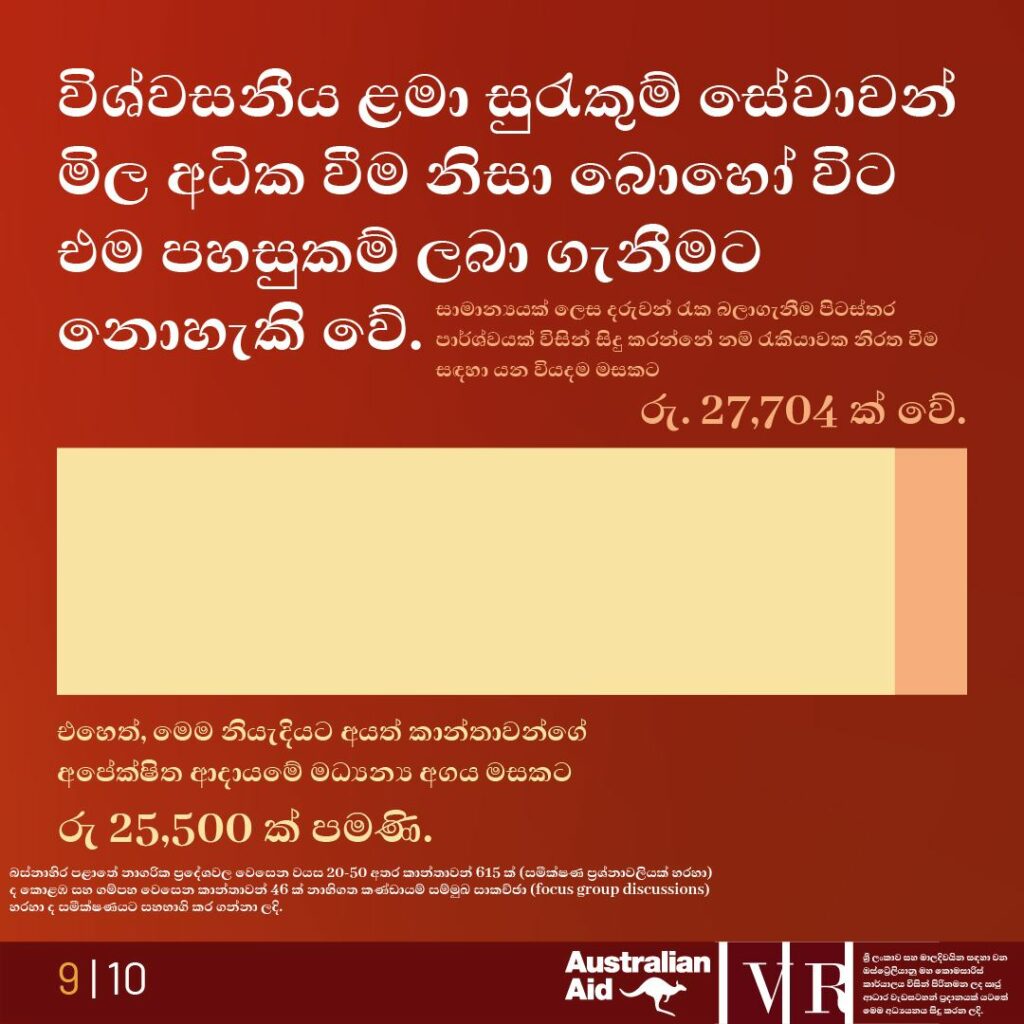 දරුවන් ඇති කාන්තාවකට රැකියාවක නිරතවීමේ දී ළමා සුරැකුම් සේවාවක හෝ ළමා සුරැකුම් සේවා පහසුකම් ලබාගැනීම ඒවායේ අධික මිල නිසා ඉතාමත් අපහසු වී ඇත. සාමාන්යයක් ලෙස දරුවකු රැක බලාගැනීම සඳහා පිටස්තර පාර්ශවයක උපකාරය ලබාගන්නේ නම් රැකියාවේ නිරතවීම සඳහා යන වියදම මසකට රුපියල් 27,704.00ක් වෙයි. නමුත් දරුවන් සහිත කාන්තාන් රැකියාවෙන් උපයන ආදායමේ මධ්යන්ය අගය මාසයකට රුපියල් 25,500.00ක් පමණි.