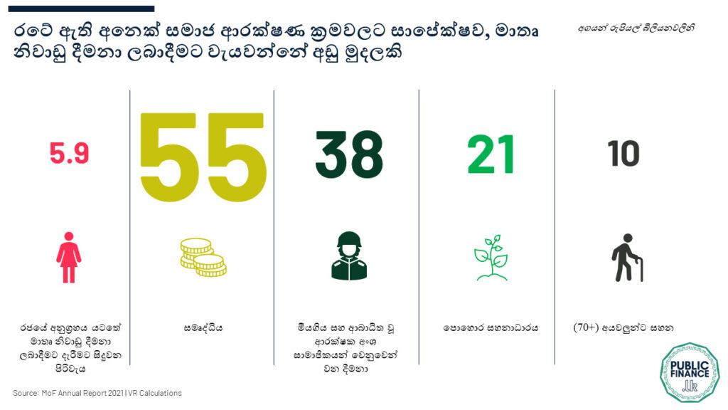 සමෘද්ධි දීමනා සඳහා රුපියල් බිලියන 55ක් වෙන්කරන විට මියගිය සහ ආබාධිත වූ ආරක්ෂක අංශ සාමාජිකයන් වෙනුවෙන් වන දීමනා සඳහා රුපියල් බිලියන 38ක් වෙන් වෙයි. පොහොර සහනාධාරයට රුපියල් බිලියන 21ක් සහ වැාඩිහිටි දීමනා සඳහා රුපියල් බිලියන 10ක් වෙන්කරන අතර රජයේ අනුග්රහය යටතේ මාතෘ නිවාඩු දීමනා ලබාදීමට දරන පිරිවැය රුපියල් බිලියන 5.9ක් වැනි ඉතා අඩු අගයක පවතී,