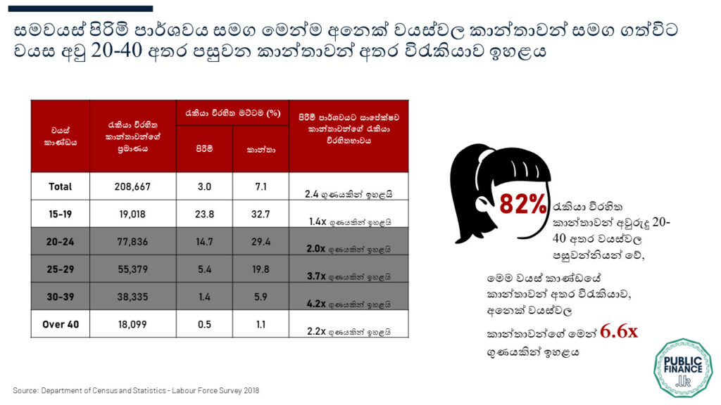 මෙහි වඩාත් ඛේදජනක තත්වයනම් විරැකියාවෙන් පෙළෙන කාන්තාවන්ගෙන් 82%ක් ම ඕනෑම පුද්ගලයකුට කාර්යක්ෂමව වැඩ කළ හැකි වයස අවුරුදු 20-40ත් අතර වයස් සීමාවේ පසුවන්නන් වීමයි. මෙම වයස් සීමාවේ කාන්තාවන් අතර වැරැකියාව අනෙක් වයස්වලට සාපේක්ෂව 6.6 ක ගුණයකින් වැඩි බව ද තහවරු වී තිබේ.