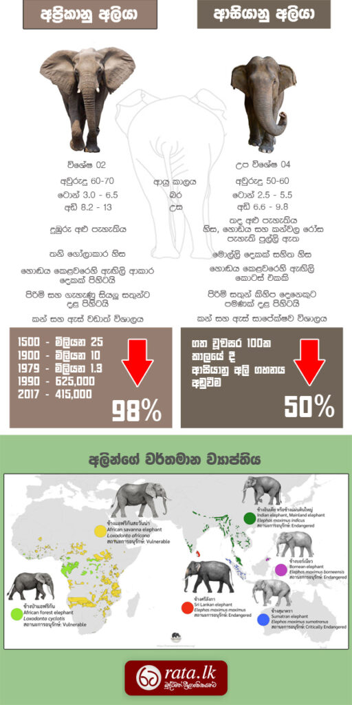 ආසියානු අලි ඇතුන්ට වඩා අප්රිකානු අලි දස ගුණයක් පමණ සිටිති 2015 දී අප්රිකානු අලිි ඇතුන් 415,000ක් පමණ ඉතිරිව සිටි බව සංඛ්යාලේඛන දත්ත නේවයි. ආසියානු අලි ඇතුන් එවකට සිටිියේ 40,000 ත් 50,000ත් අතර ප්රමාණයකි.