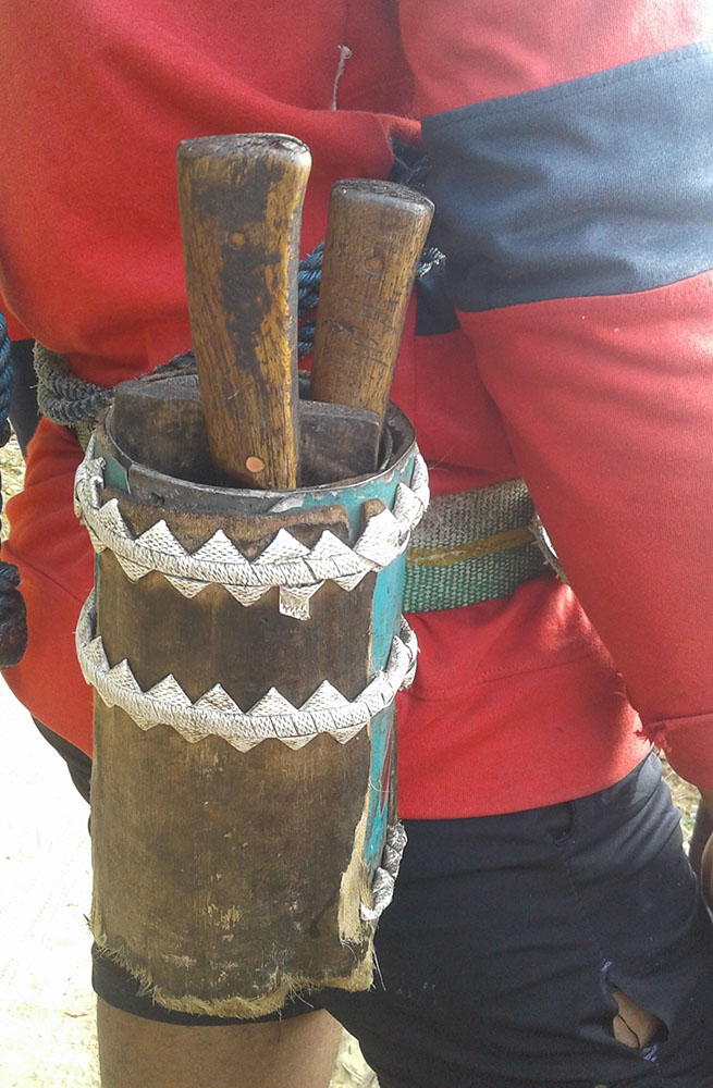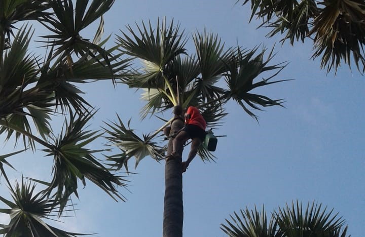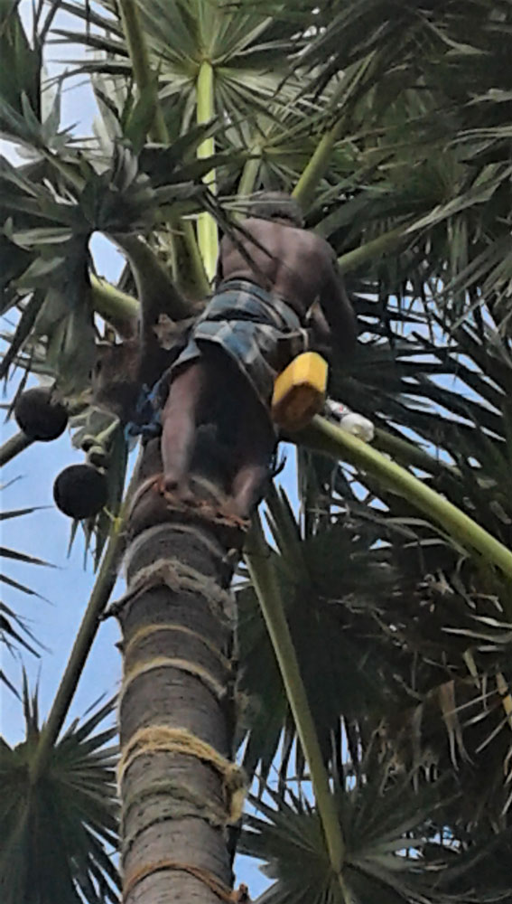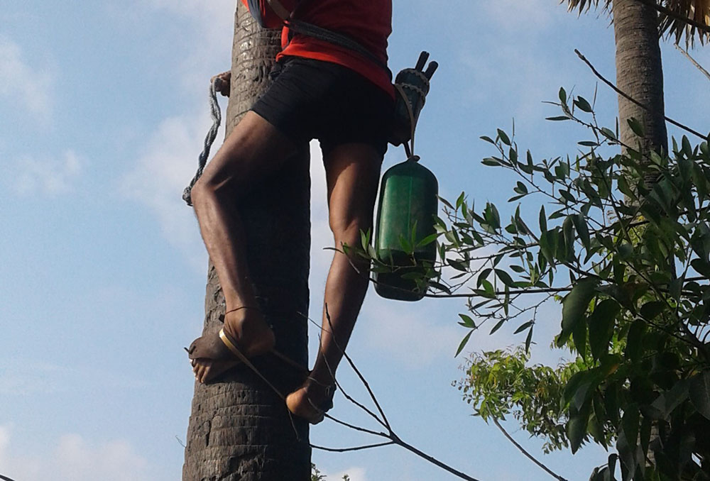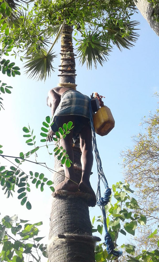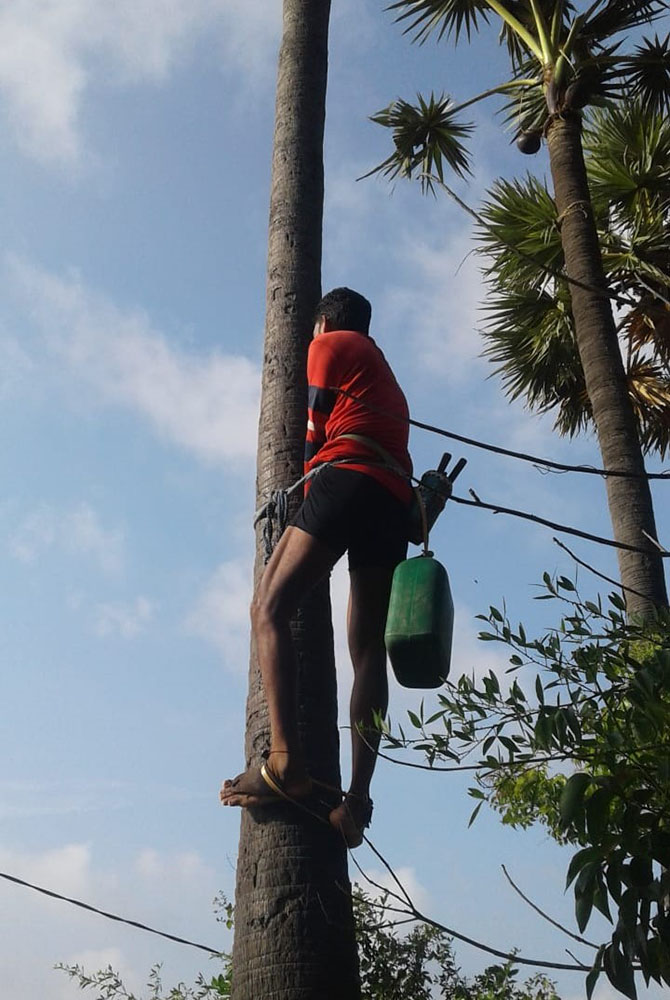 “මම ගස් නගින්න පටන් ගත්තේ තාත්තාට මේ රස්සාව කරන්න අමාරු නිසා. ඒත් තාත්තා තාමත් මාත් එක්ක රා මදින්න යනවා. ඉස්සර වගේ ඉක්මනට තාත්තාට වැඩ කරන්න බෑ. ඒ වගේ වයසක අයට ගස් නගින්න හැර ගහන්න ඕනේ. අපි ගස් නගින්නේ තල් ගහේ පිත්තෙන් ගත්ත පට්ටෙන් හදපු වළල්ලෙන්. ඒක කකුලේ දාන්න මේ වගේ ලාඩන් දෙකක් ඕනේ නැත්නම් වළල්ලට පිටිපතුල තුවාල වෙනවා. වැස්ස දවසට ගස් එකොළහේ නගින්න ලේසි නෑ, පරක්කු වෙනවා.”