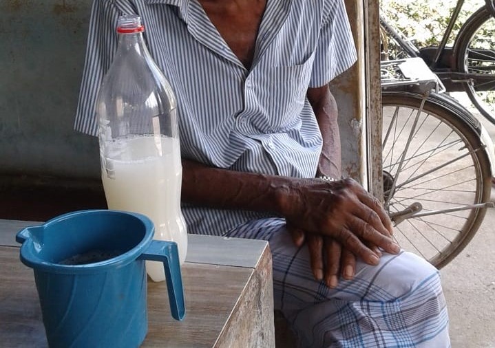 “පාන්දර හරක් ටික ලිහලා දාලා මම යන්නෙ. ගෙදර එනකොට 11 විතර වෙනවා උදේට දවල්ට දෙකටම එක වේල තමා. යාපනේ කොහෙවත් උදේට බත් නෑ. පාන්, රොටි, පිට්ටු, ඉඳිආප්ප තමයි තියෙන්නේ. බත් කන්නේ දවල්ට. මම ගස් අටක රා මදිනවා. තවත් දෙකක් මේ දවස්වල හදමින් ඉන්නේ. එක මලකින් ලීටරයක් ගන්නෙ බොහොම හදිස්සියෙන්. බෝතල් බාගයක් විතර නම් වෑස්සෙනවා. ගහකින් රා බෝතල් 4-5ක් ගන්න පුළුවන් ඒක වේලකට. දවසට රුපියල් 3,000ක් හොයන්න පුළුවන්, වෙන කරදර වුණේ නැත්නම්.” ඔහු පැවසුවේය.