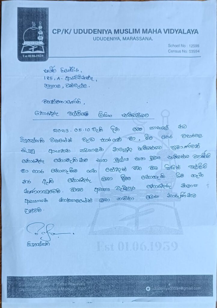 අප විසින් 2023 මැයි මස 10 වැනි දිනැතිව උඩදෙණිය මහා විද්යාලයේ තොරතුරු නිලධාරී වෙත යොමුකරන ලද ලිපියට අනුව විදුහල්පති එවූ ලිපියේ දිනයක් සඳහන් කර නැත. විදුහල්පතිගේ නම හෝ නිල මුද්රාව හෝ නැත. එමෙන්ම එවන ලද ලිපි ශීර්ෂයේ පාසලේ ලිපිනය හෝ දුරකථන අංකයවත් සටහන් කර නැත. ලිපි ශීර්ෂයේ ප්රාදේශීය ලේකම් කාර්යාලය සහ ග්රාම නිලධාරී වසම නම් සඳහන් කර තිබේ.