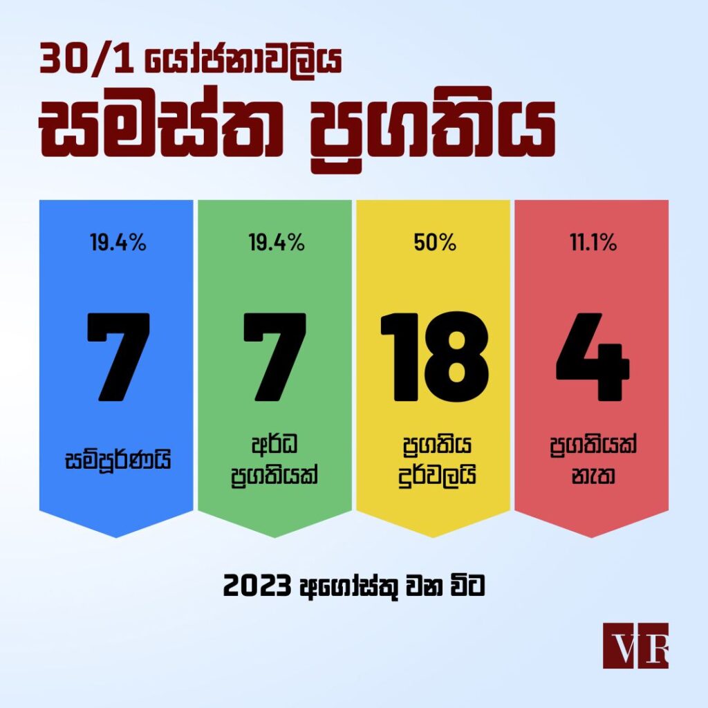 ශ්රී ලංකාවේ මානව හිමිකම් ආරක්ෂා කිරීම සඳහා ඉටුකරන බවට මෙරට රජය විසින් එක්සත් ජාකීන්ගේ මානව හිමිකම් කවුන්සිලයේ (unhrc) 30/1 යෝජනාව යටතේ ක්රියාත්මක කිරීමට එකඟ වූ කැපකිරීම්වලින් මේ වනවිට සාර්ථකව ඉටුකර ඇත්තේ 19.4%ක් වැනි ඉතාමත් සුළු ප්රමාණයකි.