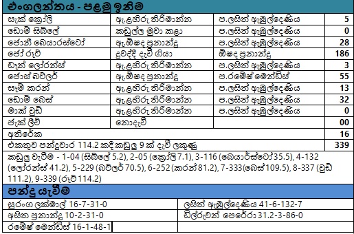 ටෙස්ට් තරග දිවියේ හොඳම පන්දු යැවීම වාර්තා කිරීමට ලසිත් ඇඹුල්දෙණිය සමත්වීමත් සමඟ එංගලන්ත පිලට එරෙහිව ගාල්ල ජාත්යන්තර ක්රීඩාංගණයේ පැවැත්වෙන දෙවැනි ටෙස්ට් තරගයේ තෙවැනි දිනට තරගය නිමා කරන විට සංචාරකයින්ගේ කඩුලු 9 ක් ලකුණු 339 ක් ඇතුළතදී දවා ගැනීමට ශ්රී ලංකා කණ්ඩායමට අද (24 දා) හැකියාව ලැබිණ. නම් දැරූ සියළු පිතිකරුවන් දැවී ගොස් තිබෙන මොහොතක එංගලන්ත පිලට ශ්රී ලංකා පළමු ඉනිම අභිබවා යෑමට අවශ්ය ලකුණු 42 ක ලබා ගැනීම සඳහා ඉතිරිව ඇත්තේ අවසන් කඩුල්ලේ සබඳතාව පමණි.