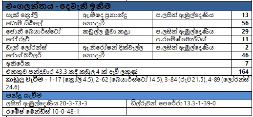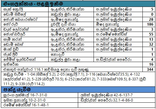 එහිදී කඩුලු 3 බැගින් බෙදා ගත් ඩොම් බෙස් සහ ජැක් ලීච්, දිවා ආහාරයෙන් පසු නැවතත් ක්රියාත්මක වෙමින් තවත් කඩුලු 2 ක් බිඳ හෙළූහ. එහෙත් 8 වැනි කඩුල්ලට එක් වුණු සුරංග ලක්මාල් සහ ලසිත් ඇඹුල්දෙණිය පන්දු 63 කදී ලකුණු 48 ක සම්බන්ධතාවයක් පවත්වමින් ශ්රී ලංකා ලකුණු පුවරුව ඉහළ දැමූහ. පන්දුවෙන් සිය උපරිමය මෙම තරගයේදී ලබා දුන් ලසිත් ඇඹුල්දෙණිය පිතිකරණයෙන්ද දායක වෙමින් ලකුණු 40 ක් රැස් කළේය. හයේ පහරකින් සහ හතරේ පහර 6 කින් තම ඉනිම වර්ණවත් කර ගත් වමත් පිතිකරුවා මුහුණ දුන් 42 වැනි පන්දුවේදී දැවී ගියේ ස්ලිප් ස්ථානයේ පන්දු රැකි ජොනී බෙයාර්ස්ටෝගේ දක්ෂ උඩ පන්දු රැකීම හේතුවෙනි.