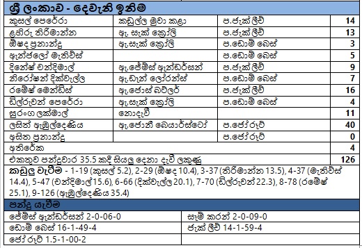 දිනය ආරම්භයේ යවන ලද 11 වැනි පන්දුවේදී එංගලන්ත අවසන් කඩුල්ල දවා ගත් ශ්රී ලංකා කණ්ඩායම ලකුණු 37 කින් පළමු ඉනිමේ වාසිය ලබා ගත්තේය. එහෙත් දෙවැනි ඉනිම ක්රීඩා කිරීම සඳහා පිටියට පිවිසි ශ්රී ලංකා පිතිකරුවන්ට එංගලන්ත දඟ පන්දු යැවීම හමුවේ දැඩි පසුබෑමක් පෙන්නුම් කළ අතර එහි ප්රථිඵලයක් ලෙස දෙවැනි ඉනිම පන්දුවාර 35.5 ක් අතුළතදී ලකුණු 126 කට සීමා විය.